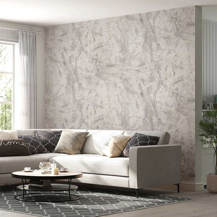مبلمان چوبی با رنگ‌های طبیعی، متریال‌های مخمل یا پارچه‌های نرم در رنگ‌های گرم، باعث ایجاد حس دلنشین و صمیمی در کنار کاغذ دیواری می‌شود. فلزات نقره‌ای یا کروم نیز مکمل ایده‌آلی برای هماهنگی با رگه‌های نقره‌ای در طرح هستند.